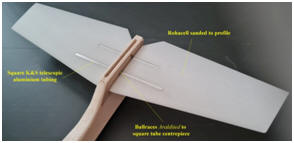 So, I decided to try my new vacuum machine by making an experimental tailplane from Rohacell, a hard closed cell foam that can be readily sanded to shape. It is expensive and comes in various sheet sizes in 1, 2 3 and 5mm thicknesses. I chose 5mm sheet and sanded a symmetrical profile and added said experimental K&S square aluminium tubing which I had never used before for the main wing dowel. I chose a pair of ball races that fitted the square tube and glued them with overnight Araldite. |